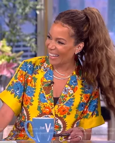 Sunny Hostin on The View on ABC was spotted wearing this yellow floral print shirt and pants on The View on Jun 20 2023's episode. Sunny's Top is the Portofino floral-print silk-twill shirt by Cara Cara . Sunny's Pants is the Amalfi floral-print silk-twill wide-leg pants by Cara Cara.