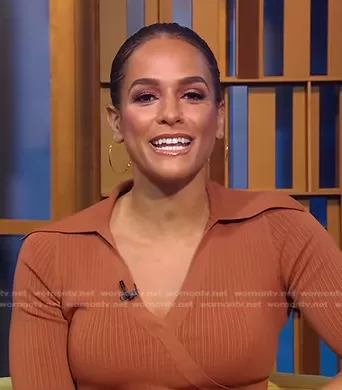 on Good Morning America on ABC was spotted wearing this brown ribbed wrap dress on Good Morning America on Jun 20 2023's episode. 's Dress is the Joanna Rib Knit Midi Dress by Nicholas.