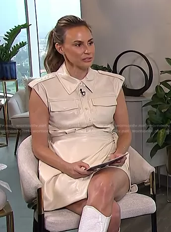 Keltie Knight on E! News on E! was spotted wearing this ivory leather mini dress on E! News on Jun 24 2023's episode. Keltie's Dress is the Lourdes Faux Leather Utility Dress by Simkhai.