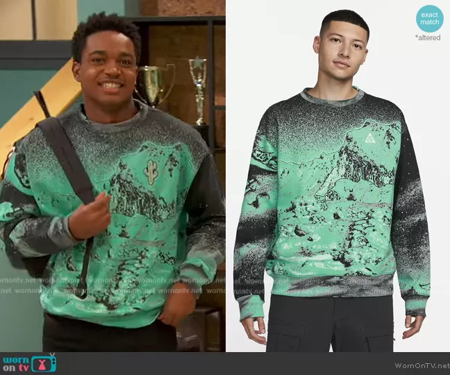 Booker Baxter (played by Issac Ryan Brown) on Ravens Home on Disney was spotted wearing this green mountain range print sweatshirt on Ravens Home on episode 'What Had Happened Was…' (6x09) in Jun 2023. Booker's Sweater is the Allover Print Fleece Crew by Nike.