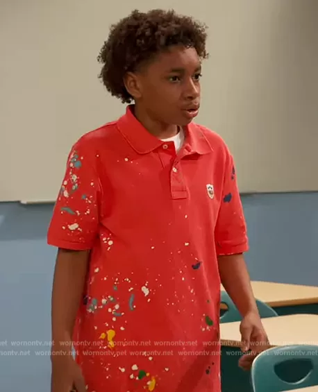 (played by JeCobi Swain) on Ravens Home on Disney was spotted wearing this red splatter print polo on Ravens Home on episode 'What Had Happened Was…' (6x09) in Jun 2023. 's Shirt is the Paint-Splatter Cotton Mesh Polo Shirt by Ralph Lauren.