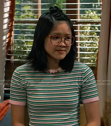 Megan (played by Grace Lu) on Bunkd on Disney was spotted wearing this pink and green striped tee on Bunkd on episode 'Most Wanted' (6x29) in Jun 2023. 's Top is the Rib Stripe Crew Neck T-Shirt by Nasty Gal.