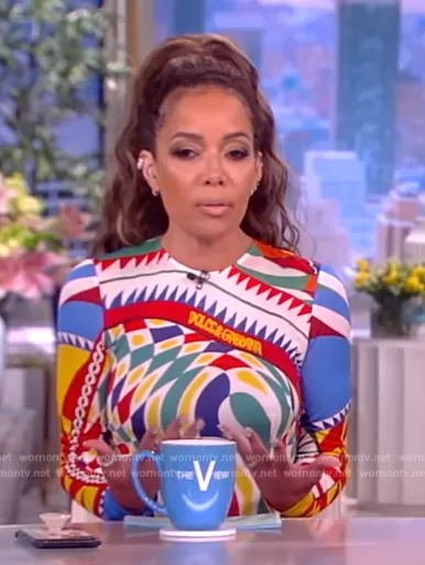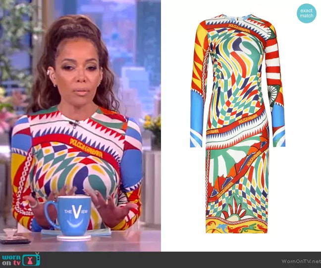 Sunny Hostin on The View on ABC was spotted wearing this abstract print dress on The View on Jun 21 2023's episode. Sunny's Dress is the Carretto-print long-sleeve dress by Dolce and Gabbana.