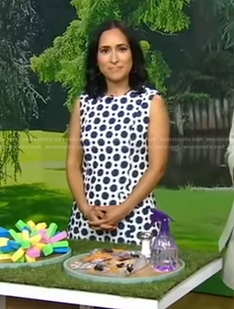 on Good Morning America on ABC was spotted wearing this white polka dot shift dress on Good Morning America on Jun 22 2023's episode. 's Dress is the Vivian Jacquard Shift Dress by Donna Morgan.