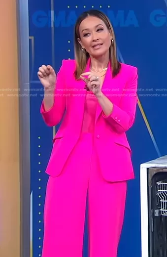 Eva Pilgrim on Good Morning America on ABC was spotted wearing this hot pink pant suit on Good Morning America on May 14 2024's episode. Eva's Jacket is the Chamberlain Blazer in Pink Glo by L'Agence . Eva's Pants is the Pilar Wide Leg Pants in Pink Glo by L'Agence.