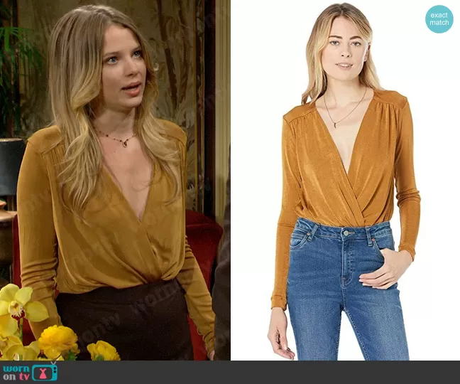 Summer Newman (played by Allison Lanier) on The Young and the Restless on CBS was spotted wearing this yellow cross front top on The Young and the Restless on Jun 25 2023's episode. Summer's Top is the Turnt Bodysuit in Golden Nugget by Free People .