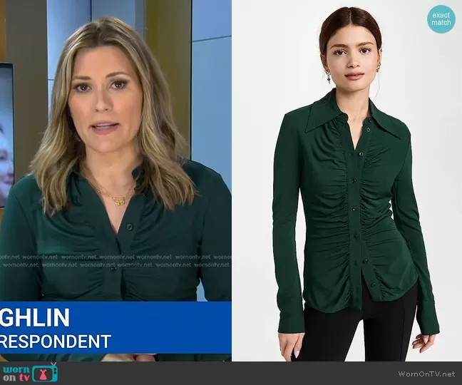 on Today on NBC was spotted wearing this green ruched button down shirt on Today on Sep 05 2023's episode. 's Top is the Matte Button Down Shirt by Proenza Schouler White Label.