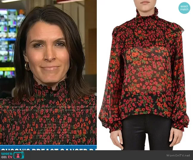 Molly Hunter on Today on NBC was spotted wearing this black floral smocked blouse on Today on Dec 27 2023's episode. Molly's Top is the Floral-Print Silk Blouse by The Kooples.