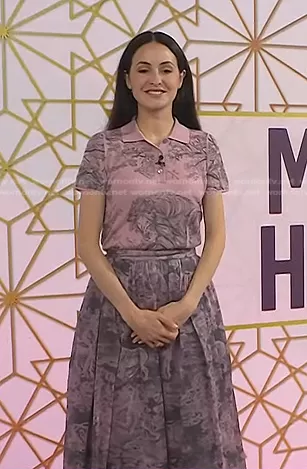 on Today on NBC was spotted wearing this pink print polo top and skirt on Today on Jun 26 2023's episode. 's Top is the Dioriviera Cropped Polo Shirt by Dior . 's Skirt is the Dioriviera Flared Skirt by Dior.