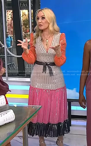 Chassie Post on Today on NBC was spotted wearing this Chassie’s sequin stripe colorblock dress on Today on Jun 26 2023's episode. Chassie's Dress is the Devon Colorblock Silk Sequin Dress by Saloni.