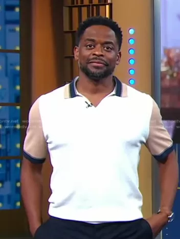 on Good Morning America on ABC was spotted wearing this white and beige colorblock polo shirt on Good Morning America on Jun 26 2023's episode. 's Shirt is the Kingsford Short Sleeved Open Collar Polo Shirt by Reiss.