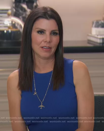 Heather Dubrow on The Real Housewives of Orange County on Bravo was spotted wearing this blue ribbed sleeveless dress on The Real Housewives of Orange County on episode 'We Cut It Close(ed)' (17x03) in Jun 2023. Heather's Dress is the Crewneck Sleeveless Bodycon Dress by Helmut Lang . Heather's Necklace is the Monogram Flower Silver by Louis Vuitton.
