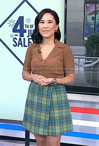 Vicky Nguyen on Today on NBC was spotted wearing this brown ribbed polo top and plaid skirt on Today on Jun 27 2023's episode. Vicky's Top is the Victor Rib-Knit Sweater by Sandro . Vicky's Skirt is the Darla Plaid Skirt by Sandro.