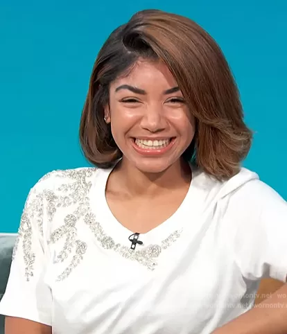 on Access Hollywood on NBC was spotted wearing this white beaded tee on Access Hollywood on Jun 27 2023's episode. 's Top is the Stras Beaded T-Shirt by Sandro.