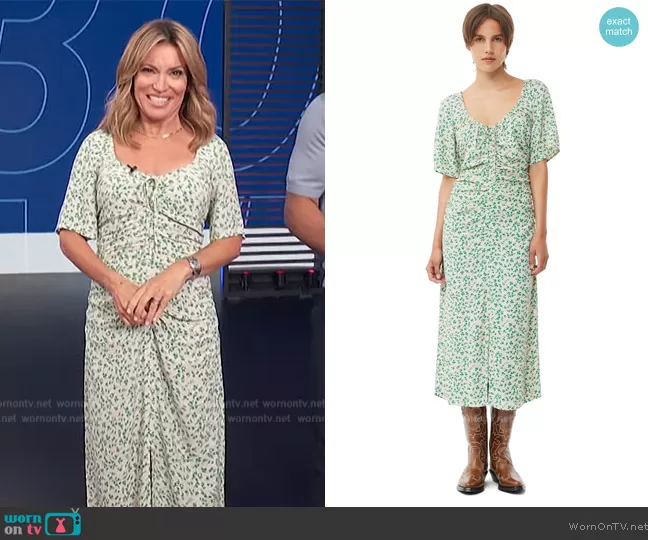 Kit Hoover on Access Hollywood on NBC was spotted wearing this green floral print ruched dress on Access Hollywood on Oct 06 2023's episode. Kit's Dress is the Printed Crepe U-Neck Midi Dress by Ganni.