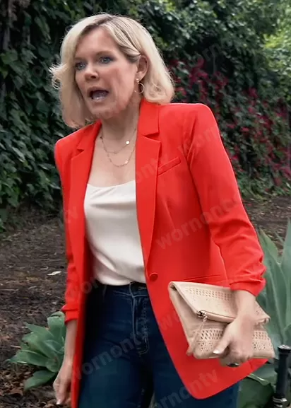 Ava Jerome (played by Maura West) on General Hospital on ABC was spotted wearing this red blazer on General Hospital on Jun 29 2023's episode. Ava's Jacket is the Khloe Blazer by Cinq a Sept.