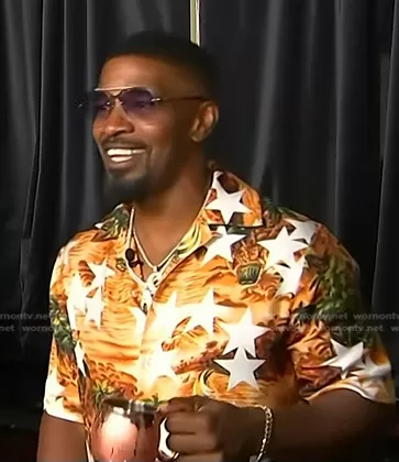 on Access Hollywood on NBC was spotted wearing this star print shirt on Access Hollywood on Jun 29 2023's episode. 's Shirt is the Silk Graphic-Print Shirt by Amiri.