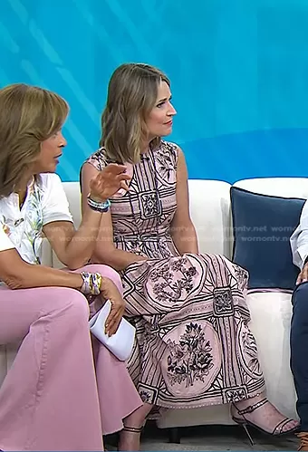 Savannah Guthrie on Today on NBC was spotted wearing this pink floral sleeveless dress on Today on Jun 30 2023's episode. Savannah's Dress is the Sleeveless A-Line Midi Dress by Lela Rose . Savannah's Shoes is the Fersen Suede-Trimmed PVC Sandals by Manolo Blahnik.