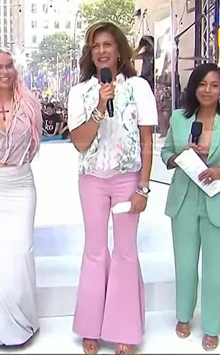 Hoda Kotb on Today on NBC was spotted wearing this white floral embroidered top and pink flare jeans on Today on Jun 30 2023's episode. Hoda's Top is the Eliana Embroidered Top by Tiny.