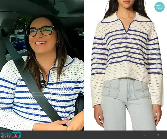 Savannah Sellers on Today on NBC was spotted wearing this white stripe knit sweater on Today on Jun 30 2023's episode. Savannah S's Sweater is the Elise Stripe Sweater by Sandro.