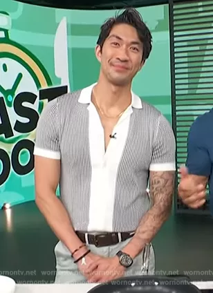 Express Printed Short Sleeve Sweater Polo worn by Ronnie Woo on Access Hollywood