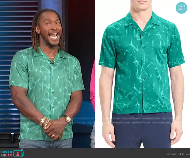 Scott Evans on Access Hollywood on NBC was spotted wearing this green printd shirt on Access Hollywood on Jul 01 2023's episode. Scott's Shirt is the Irving Short Sleeve Button Front Camp Shirt by Theory.