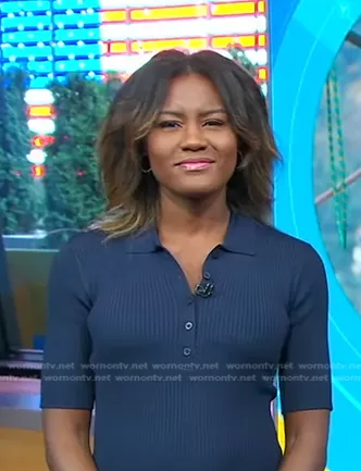 Janai Norman on Good Morning America on ABC was spotted wearing this navy ribbed polo dress on Good Morning America on Jul 03 2023's episode. Janai's Dress is the Rib-Knit Polo Sweaterdress by Lauren Ralph Lauren.