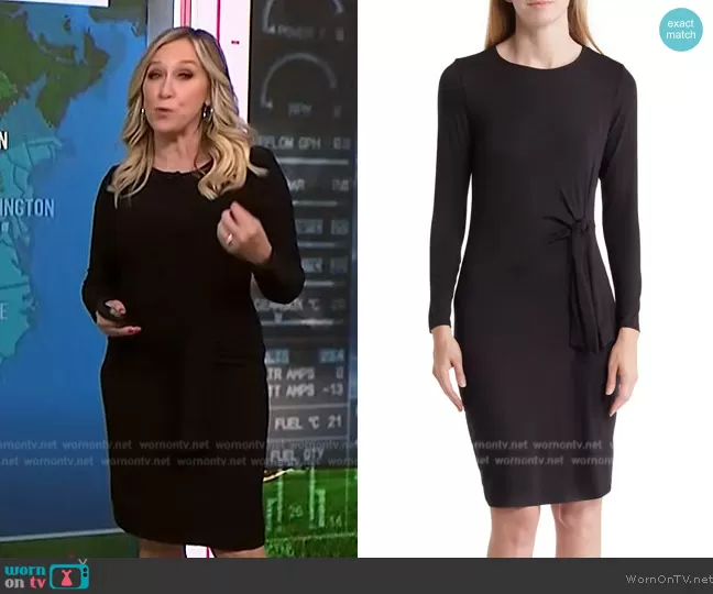 on NBC News Daily on NBC was spotted wearing this black tie front dress on NBC News Daily on Jul 03 2023's episode. 's Dress is the Side Knot Long Sleeve Dress by West K.