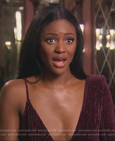 Charity Lawson on The Bachelorette on ABC was spotted wearing this burgundy one shoulder dress on The Bachelorette on episode 'Week 2' (20x02) in Jul 2023. Charity's Dress is the Sean Velvet One-Shoulder Gown by Michael Costello Collection.