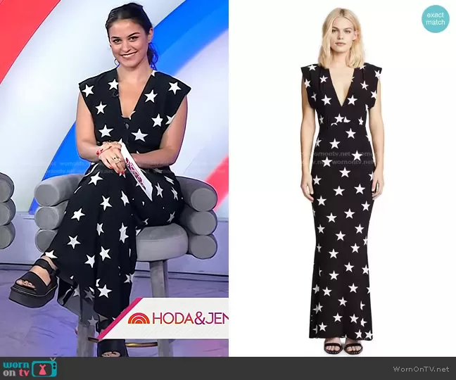 Donna Farizan on Today on NBC was spotted wearing this black star print dress on Today on Jul 04 2023's episode. Donna's Dress is the V Neck Rectangle Gown by Norma Kamali . Donna's Shoes is the Voss Quad Hydro Leather Platform Sandal by Dr. Martens.