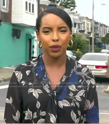 on Good Morning America on ABC was spotted wearing this black floral print blouse on Good Morning America on Jul 04 2023's episode. 's Top is the Floral Tie Neck Blouse by Jason Wu.
