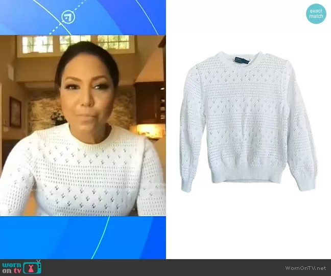 Stephanie Ramos on Good Morning America on ABC was spotted wearing this white pointelle knit sweater on Good Morning America on Jul 04 2023's episode. Stephanie's Sweater is the Diamond Knit Sweater by Polo Ralph Lauren.