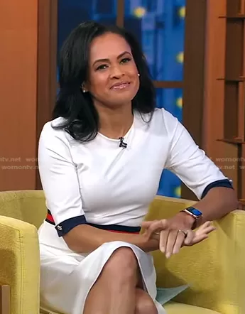 Linsey Davis on Good Morning America on ABC was spotted wearing this white stripe-waist dress on Good Morning America on Jul 04 2023's episode.