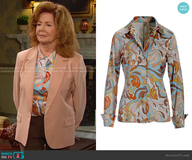 Maggie Horton (played by Suzanne Rogers) on Days of our Lives on Peacock was spotted wearing this printed button down blouse on Days of our Lives on May 19 2025's episode. Maggie's Top is the Folk Favorite Print Sophia Button Up Charmeuse Blouse by Boston Proper.