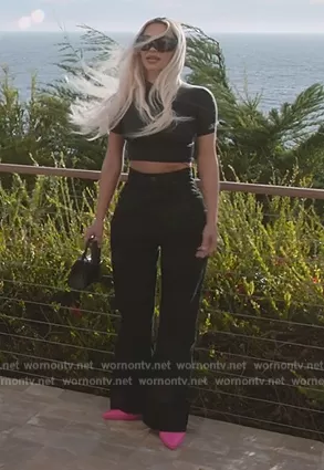 Kim Kardashian (played by Kim Kardashian) on The Kardashians on Hulu was spotted wearing this short sleeve top and handbag on The Kardashians on episode 'Deeper Than Dolce' (3x07) in Jul 2023. Kim's Top is the Short Sleeve Fitted Top by Balenciaga . Kim's Sunglasses is the Tinted-lens cat-eye sunglasses by Balenciaga . Kim's Bag is the Hourglass XS croc-effect leather tote by Balenciaga . Kim's Shoes is the XL 110mm padded pumps by Balenciaga.