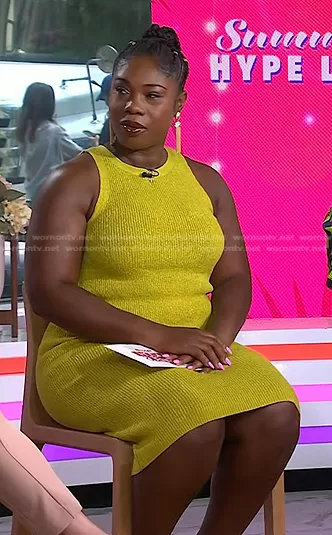 on Today on NBC was spotted wearing this yellow ribbed knit top and skirt on Today on Jul 06 2023's episode. 's Sweater is the Cropped Ribbed Sleeveless Sweater by Calvin Klein . 's Skirt is the Ribbed Sweater Pencil Skirt by Calvin Klein.
