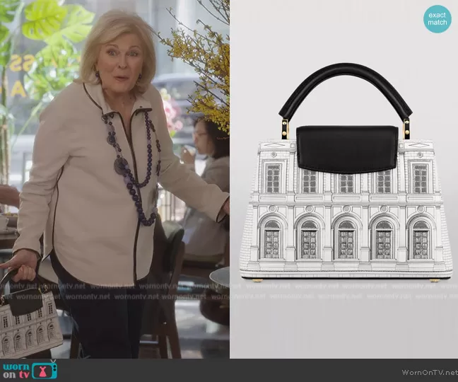 (played by Candice Bergen) on And Just Like That on HBO was spotted wearing this white printed bag on And Just Like That on episode 'Alive' (2x04) in Jul 2023. 's Bag is the Architettura Capucines BB Top-Handle Bag by Louis Vuitton.