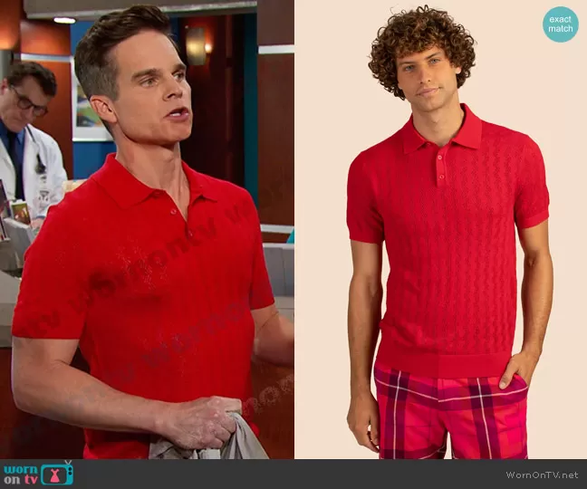 Leo Stark (played by Greg Rikaart) on Days of our Lives on Peacock was spotted wearing this red polo shirt on Days of our Lives on Jul 07 2023's episode. Leo's Shirt is the Herse Short Sleeve Polo by Mr Turk . Leo's Pants is the Alex Slim Trouser by Mr Turk.