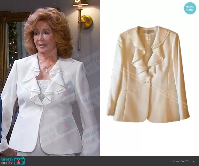 Maggie Horton (played by Suzanne Rogers) on Days of our Lives on Peacock was spotted wearing this white ruffle blazer on Days of our Lives on Jul 07 2023's episode. Maggie's Jacket is the Ruffle Jacket in Ivory White by Tahari AsL.