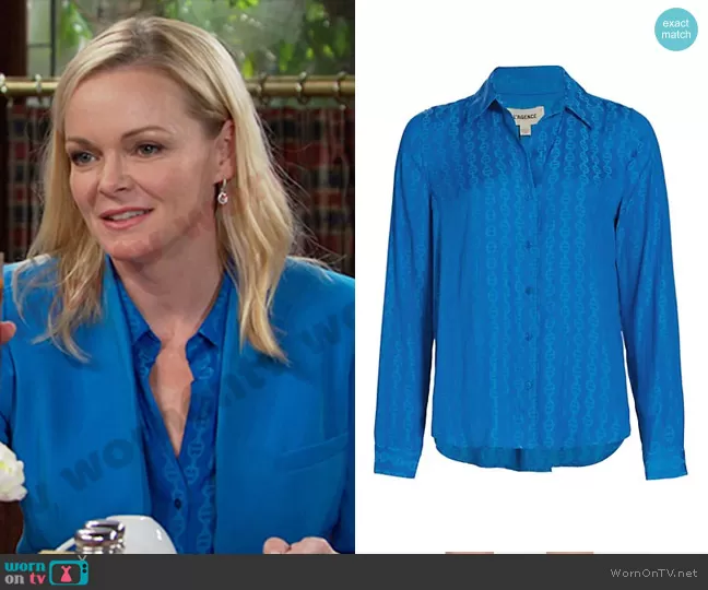 Belle Brady (played by Martha Madison) on Days of our Lives on Peacock was spotted wearing this blue print shirt and open jacket on Days of our Lives on Jul 07 2023's episode. Belle's Top is the Holly Chain Print Button-Up Shirt by L'Agence . Belle's Jacket is the Open Front Blazer by Halogen.