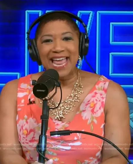 Deja Vu on Live with Kelly and Mark on Disney ABC Home Entertainment was spotted wearing this orange floral print cowl neck dress on Live with Kelly and Mark on Jul 06 2023's episode. Deja Vu's Dress is the Sleeveless Draped-Neck Floral-Print Maxi Dress by Robbie Bee.