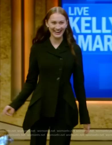 on Live with Kelly and Mark on Disney ABC Home Entertainment was spotted wearing this black asymmetric jacket and pants on Live with Kelly and Mark on Jul 06 2023's episode. 's Jacket is the Asymmetric Crepe Blazer by Proenza Schouler . 's Pants is the Stretch Crepe Pants by Proenza Schouler . 's Earrings is the Max Pink Crystal Heart Single Drop Earring in Palladium Tone by Justine Clenquet.