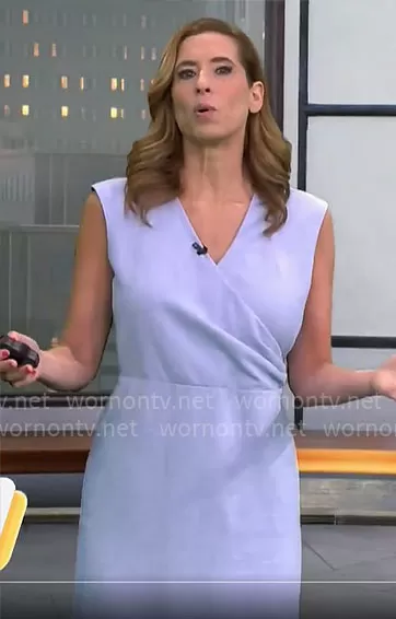 Stephanie Abrams on CBS Mornings on CBS was spotted wearing this Stephanie Abrams’ light blue cross front dress on CBS Mornings on Jun 11 2024's episode. Stephanie's Dress is the The Side Tuck Wrap Sheath Dress in Cross Weave in Deep Wisteria by Ann Taylor .