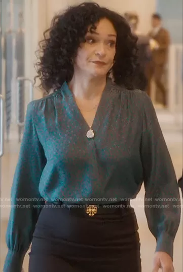 Francey (played by Rosa Arredondo) on So Help Me Todd on CBS was spotted wearing this green printed blouse and logo belt on So Help Me Todd on episode 'Ivan the Terrible' (1x15) in Jun 2023. Francey's Top is the Clementine Blouse by Lafayette 148 NY . Francey's Belt is the Britten Belt by Tory Burch.