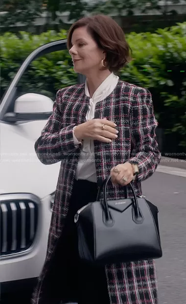 Margaret Wright (played by Marcia Gay Harden) on So Help Me Todd on CBS was spotted wearing this plaid tweed coat on So Help Me Todd on episode 'Twelve Worried Persons' (1x16) in Jun 2023. Margaret's Jacket is the Collarless Plaid Topper Jacket by Calvin Klein . Margaret's Bag is the Small Antigona Leather Satchel by Givenchy.