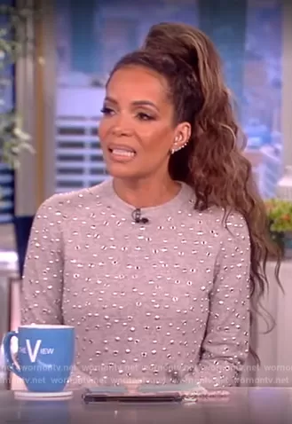 Sunny Hostin on The View on ABC was spotted wearing this gray embellished sweater on The View on Jul 10 2023's episode. Sunny's Sweater is the Embellished Cashmere Sweater by Michael Kors.