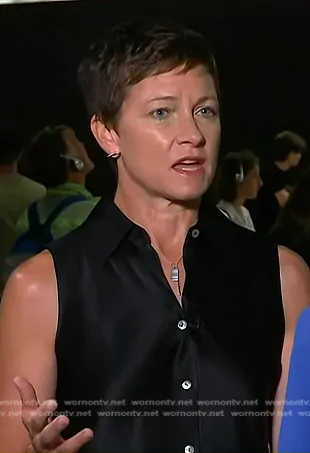 Stephanie Gosk on Today on NBC was spotted wearing this black sleeveless satin shirt on Today on Aug 08 2025's episode. Stephanie's Top is the Silk Bias-Cut Sleeveless Shirt by Vince.