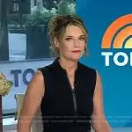 Savannah Guthrie on Today on NBC was spotted wearing this black zip top and poppy print skirt on Today on Jul 11 2023's episode. Savannah's Top is the Sleeveless Front Zip Polo Shirt by Akris Punto . Savannah's Skirt is the Poppy Print Midi-Skirt by Dolce & Gabbana . Savannah's Shoes is the Cutout Platform Heeled Sandals by Gucci.