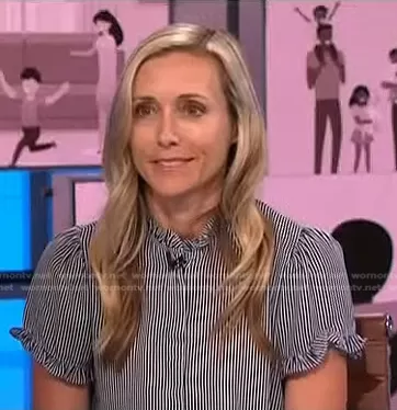 on NBC News Daily on NBC was spotted wearing this striped ruffle trim blouse on NBC News Daily on Jul 11 2023's episode. 's Top is the Covered Ruffle Neck Placket Short Sleeve Top by T Tahari.
