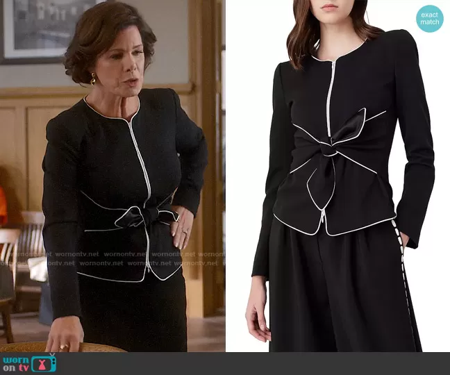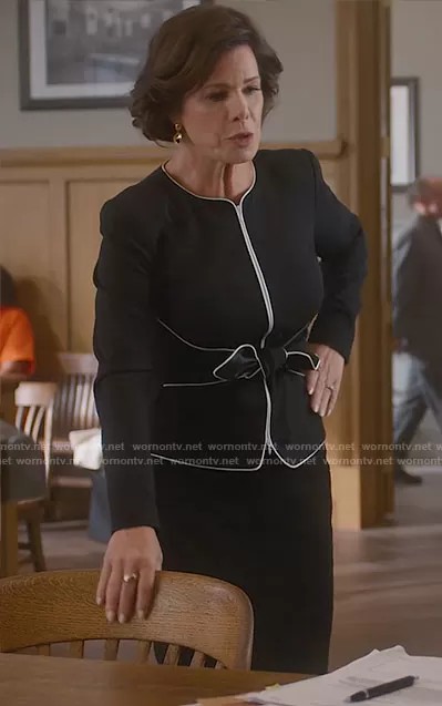 Margaret Wright (played by Marcia Gay Harden) on So Help Me Todd on CBS was spotted wearing this black bow waist jacket with white trim on So Help Me Todd on episode 'Let the Wright One In' (1x05) in Jun 2023. Margaret's Jacket is the Tie Front Blazer by Emporio Armani.